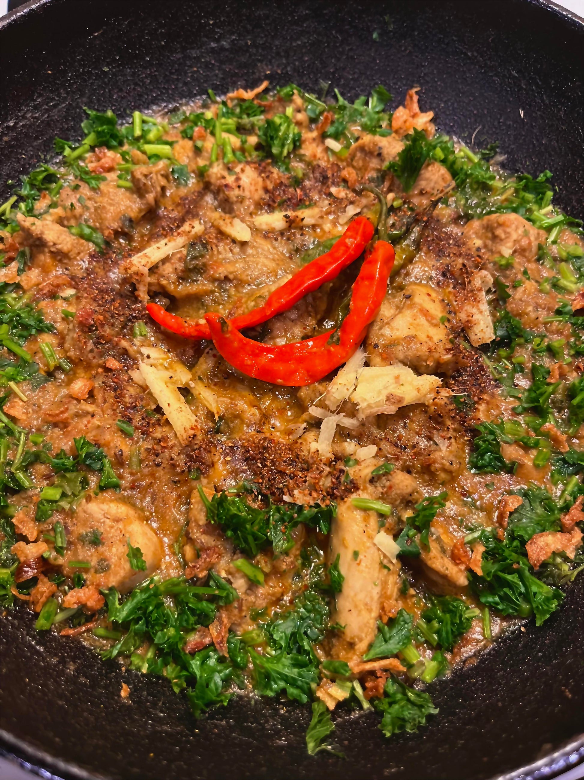 - In a wok, add 1 kg chicken, 1 teaspoon of salt, spices, and 1.5 cups of water. Bring to boil, cover, and cook on low heat for 25 minutes or until the chicken is tender (goat 45 minutes/ beef 60 minutes).